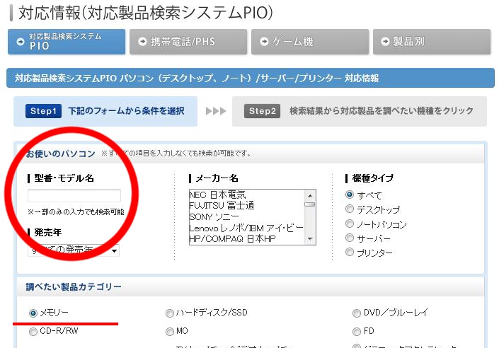 自分の所有PCの型番が明確になったら、適合するメモリを探しに行きます。