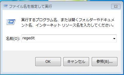スタート画面内、「ファイル名を指定して実行」で出てきた画面に「regedit」と入力→「OK」、