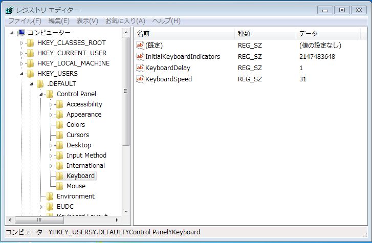 ②. HKEY_USERS\.Default\Control Panel\Keyboard に移動します。